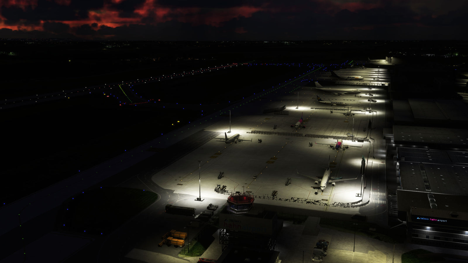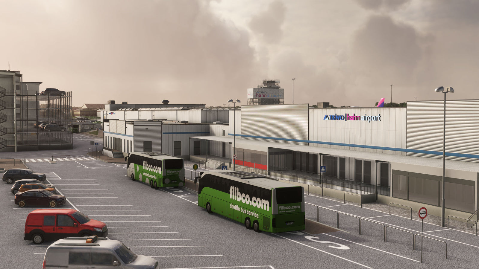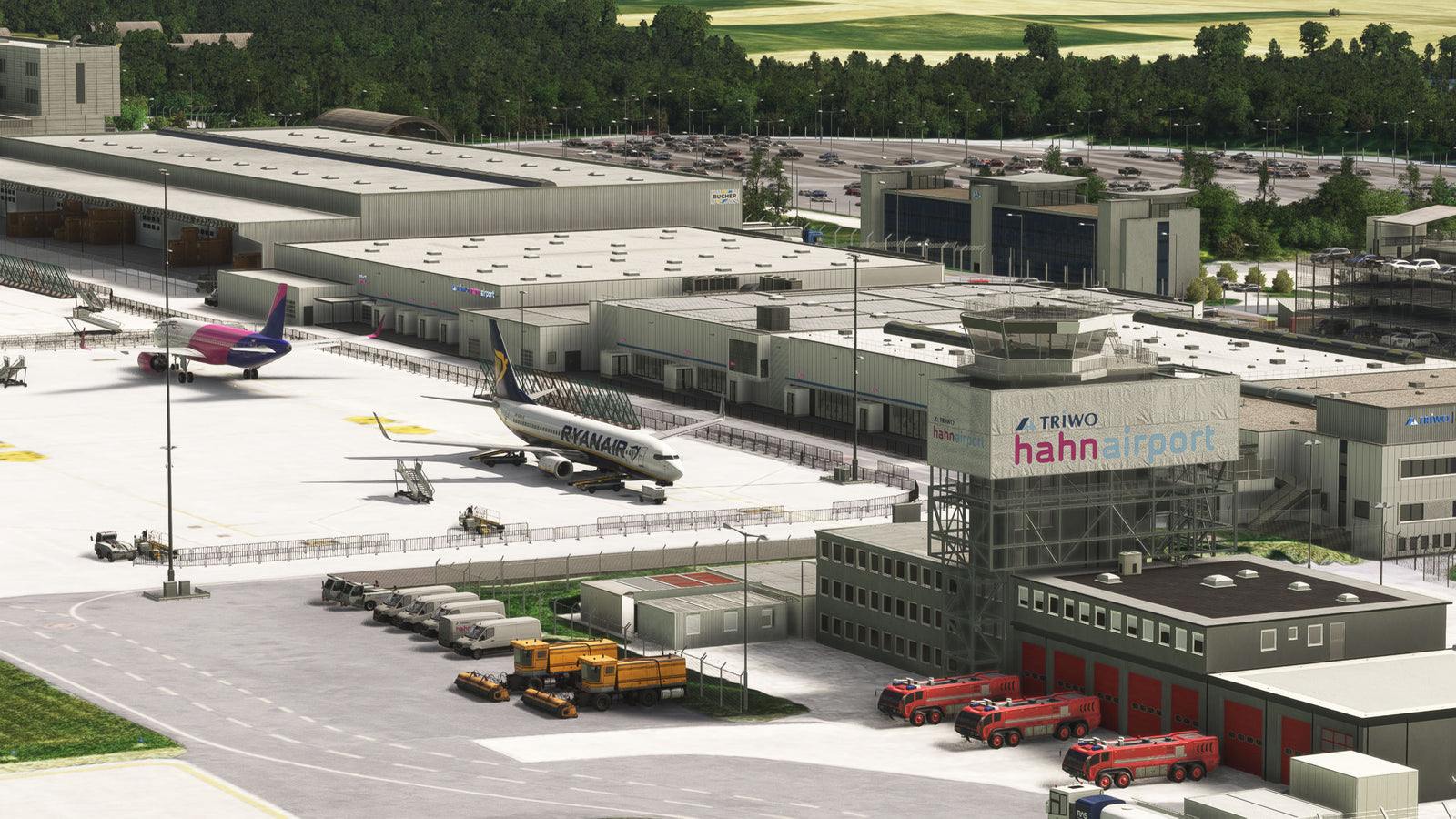 This scenery brings Hahn to life with high-quality modeling, realistic textures, and detailed surroundings - including the iconic control tower, terminal interiors, cargo facilities, and apron areas. Sloped terrain and accurate ground layouts ensure an authentic experience both in the cockpit and from the ground.