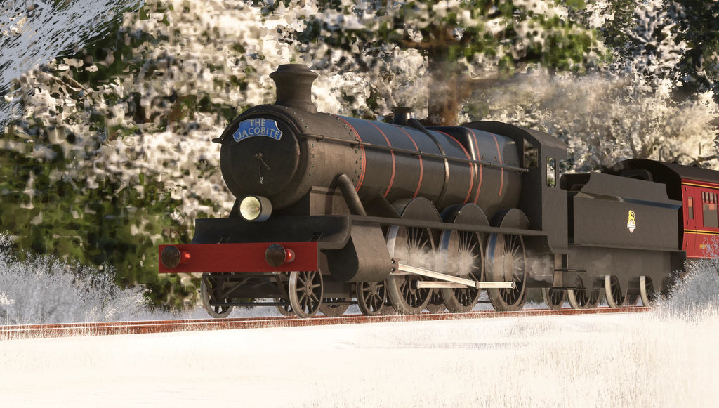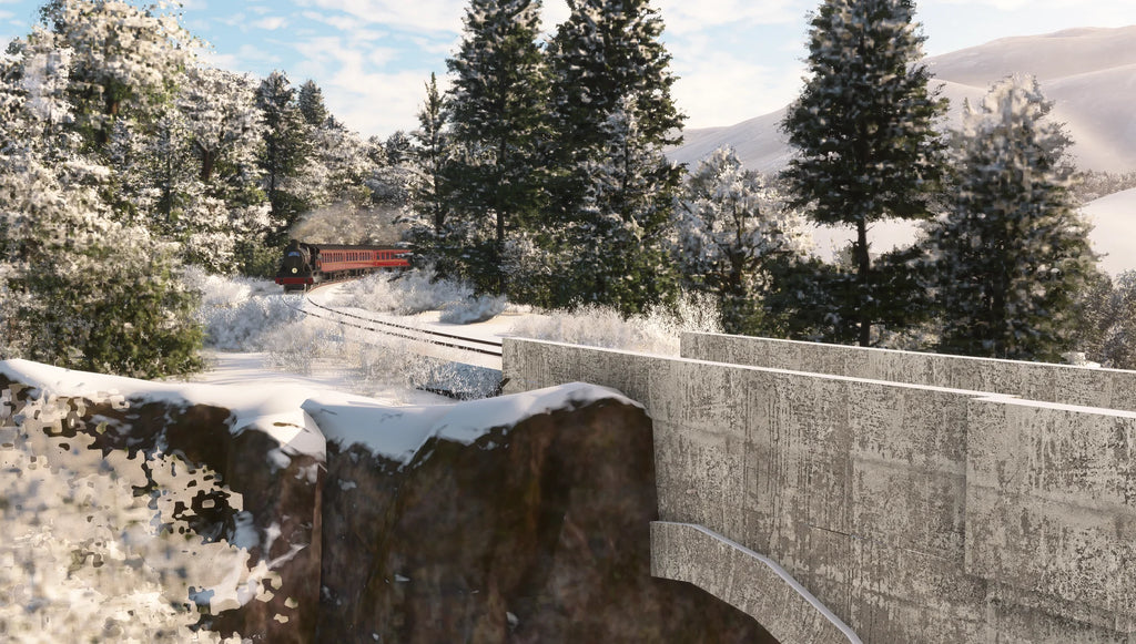 A detailed animation of the Jacobite Train travelling over Glenfinnan Viaduct to a station in Scotland with a nearby helipad.