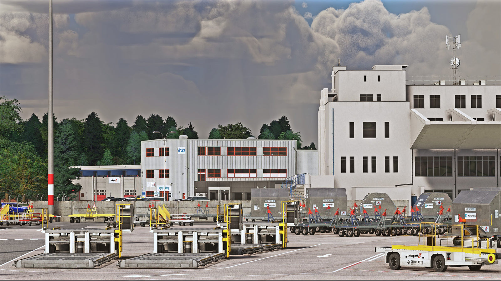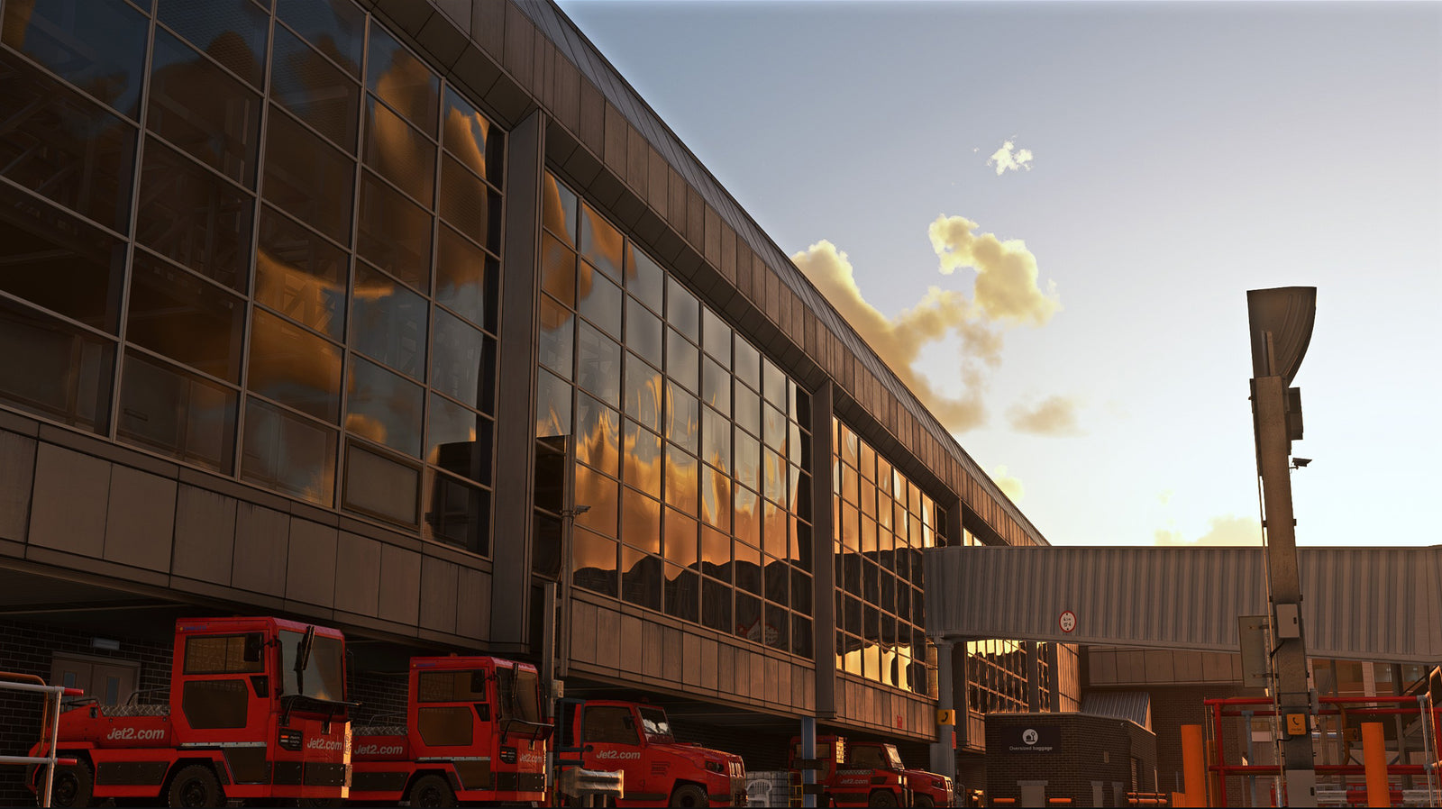 The airport includes a complete set of custom ground service equipment tailored to Birmingham. From baggage carts to tugs and GPU units, these assets reflect the actual types of vehicles seen at BHX, helping to create a more believable airside environment.